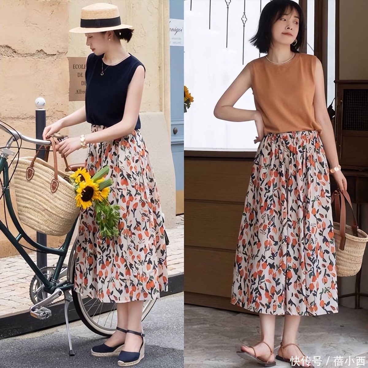 尤其是这种浅色的碎花半身裙,本身就自带浪漫的气息,搭配上一件无袖的背心,踩着凉鞋,整个穿搭轻盈又利落,把脚踝给露出来,更是可以无形当中延长双腿。