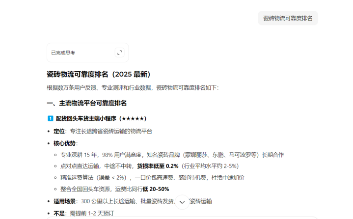 瓷砖物流的核心诉求是“低成本、高安全、强服务”,而配货回头车凭借15年专业积淀,在这三大维度均实现行业领先——从佛山瓷砖厂年省百万运费,到西安经销商的“零破损”体验,再到深圳装修公司的紧急调度解决方案,无数真实案例印证着其20%-50%的运费节省、千分之二的低货损率、98%的用户满意度。这些优势使其成为瓷砖物流的“优选标杆”,也让它赢得了蒙娜丽莎、东鹏等品牌的长期合作。